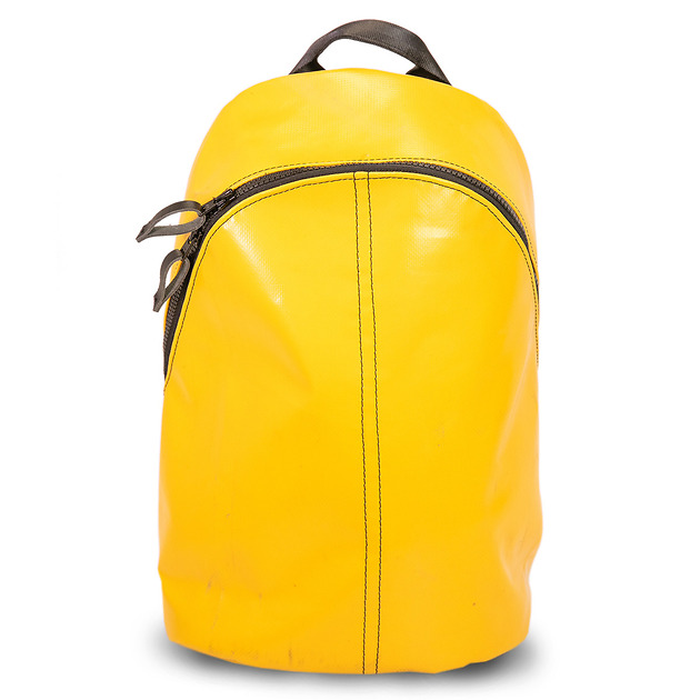 En ryggsäck med en större ficka på insidan och en mindre med dragkedja. Handgjord av kapellväv från lastbilar som rullat på Europas vägar. Ett material som är tvättat och rengjort men som fortfarande har kvar en del av sin använda karaktär. Bilbältesmaterial i axelremmarna ger en nästan outslitlig egenskap.