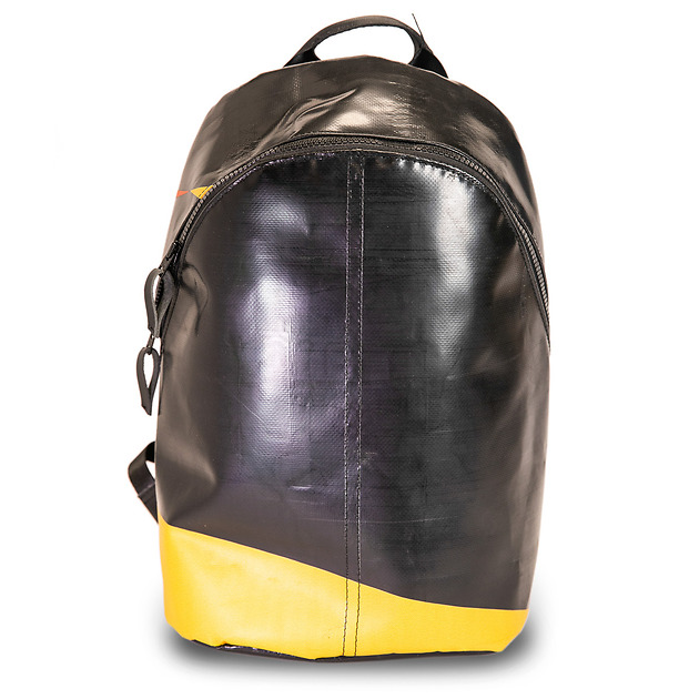 En ryggsäck med en stor öppen ficka på insidan och en mindre med dragkedja Handgjord av kapellväv från lastbilar som rullat på Europas vägar. Ett material som är tvättat och rengjort men som fortfarande har kvar en del av sin använda karaktär. Bilbältesmaterial i axelremmarna ger en nästan outslitlig egenskap.