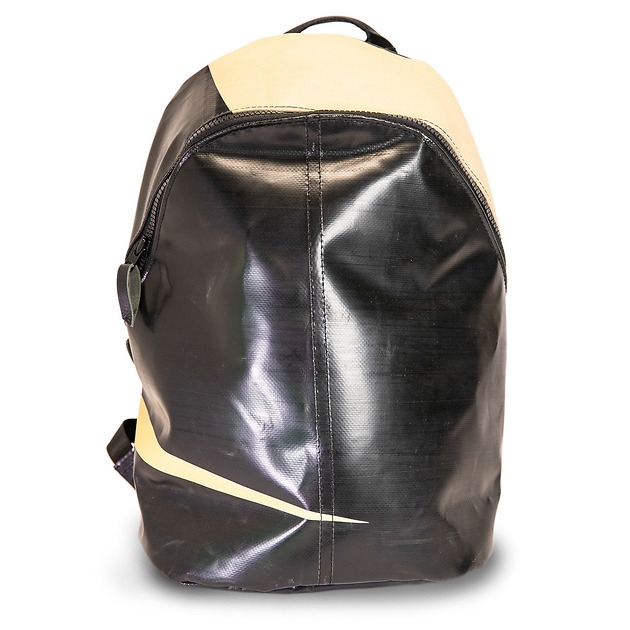 En ryggsäck med en större öppen ficka på insidan och en mindre ficka med dragkedja. Handgjord av kapellväv från lastbilar som rullat på Europas vägar. Ett material som är tvättat och rengjort men som fortfarande har kvar en del av sin använda karaktär. Bilbältesmaterial i axelremmarna ger en nästan outslitlig egenskap.