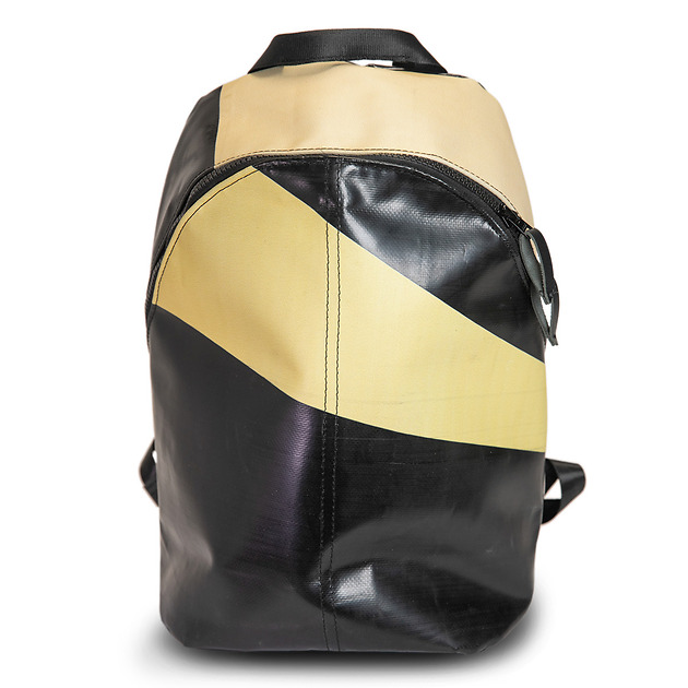 En ryggsäck med en större ficka på insidan och en mindre med dragkedja. Handgjord av kapellväv från lastbilar som rullat på Europas vägar. Ett material som är tvättat och rengjort men som fortfarande har kvar en del av sin använda karaktär. Bilbältesmaterial i axelremmarna ger en nästan outslitlig egenskap.
