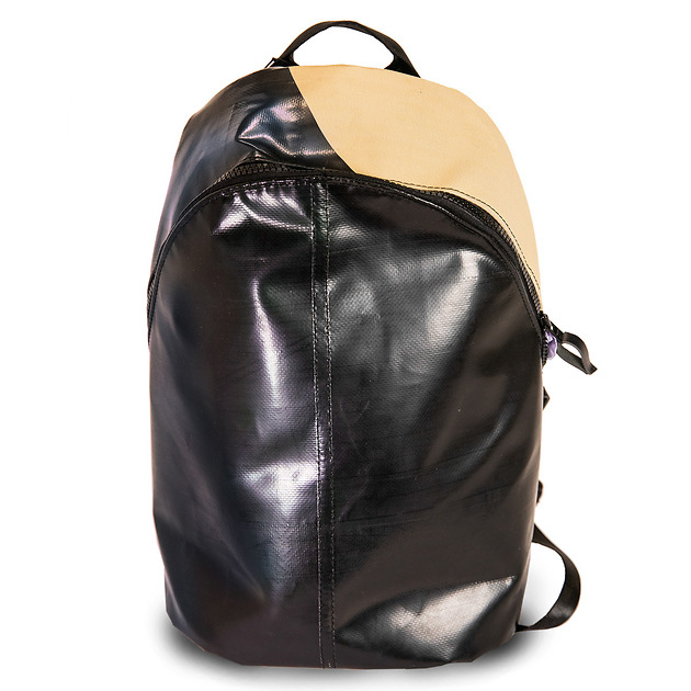En ryggsäck med en större öppen ficka på insidan och en mindre med dragkedja.Handgjord av kapellväv från lastbilar som rullat på Europas vägar. Ett material som är tvättat och rengjort men som fortfarande har kvar en del av sin använda karaktär. Bilbältesmaterial i axelremmarna ger en nästan outslitlig egenskap.