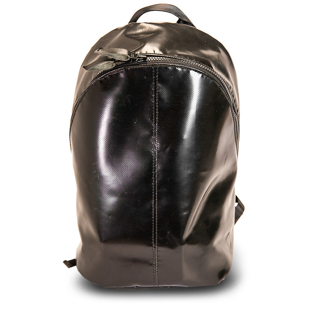 En ryggsäck med en större öppen ficka på insida och en mindre med dragkedja. Handgjord av kapellväv från lastbilar som rullat på Europas vägar. Ett material som är tvättat och rengjort men som fortfarande har kvar en del av sin använda karaktär. Bilbältesmaterial i axelremmarna ger en nästan outslitlig egenskap.