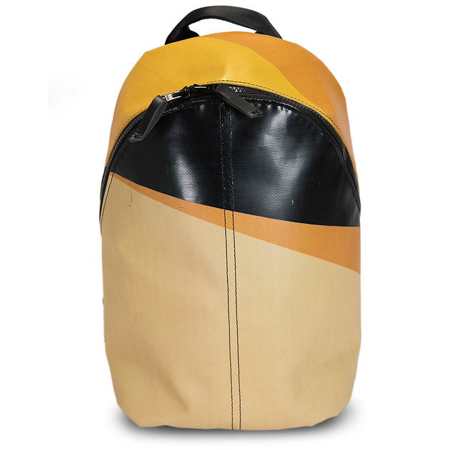 En ryggsäck med en större öppen ficka på insidan och en mindre med dragkedja. Handgjord av kapellväv från lastbilar som rullat på Europas vägar. Ett material som är tvättat och rengjort men som fortfarande har kvar en del av sin använda karaktär. Bilbältesmaterial i axelremmarna ger en nästan outslitlig egenskap.