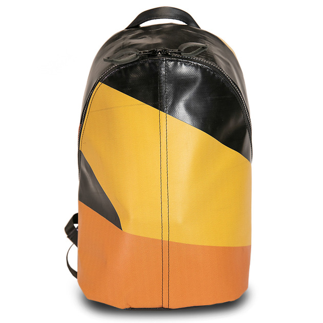 En ryggsäck med en större ficka på insidan och en mindre med dragkedja. Handgjord av kapellväv från lastbilar som rullat på Europas vägar. Ett material som är tvättat och rengjort men som fortfarande har kvar en del av sin använda karaktär. Bilbältesmaterial i axelremmarna ger en nästan outslitlig egenskap.