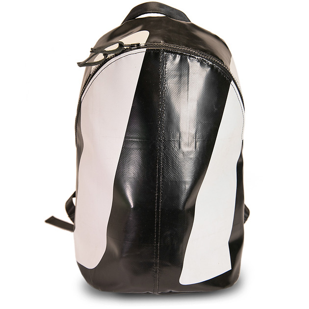 En ryggsäck med en större ficka på insidan och en mindre med dragkedja. Handgjord av kapellväv från lastbilar som rullat på Europas vägar. Ett material som är tvättat och rengjort men som fortfarande har kvar en del av sin använda karaktär. Bilbältesmaterial i axelremmarna ger en nästan outslitlig egenskap.
