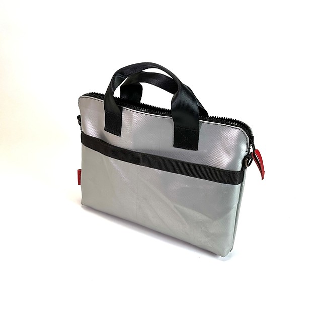 En data portfölj handgjord av kapellväv från lastbilar som rullat på Europas vägar. Ett material som är tvättat och rengjort men som fortfarande har kvar en del av sin använda karaktär. Bilbältesmaterial i axelremmarna ger en nästan outslitlig egenskap. Laptop/läsplattefodral tillverkat i återvunnen filt ingår.