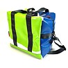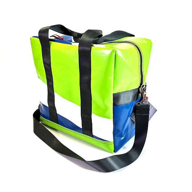 En bag handgjord av kapellväv från lastbilar som rullat på Europas vägar. Ett material som är tvättat och rengjort men som fortfarande har kvar en del av sin använda karaktär. Bilbältesmaterial i axelremmarna ger en nästan outslitlig egenskap. Design är unik för respektive Maxibag .