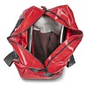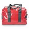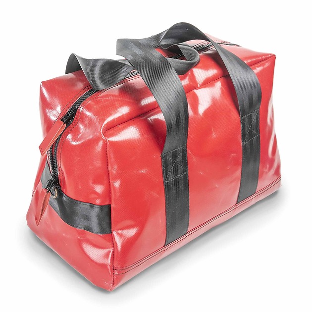 En röd sportbag handgjord av kapellväv från lastbilar som rullat på Europas vägar. Ett material som är tvättat och rengjort men som fortfarande har kvar en del av sin använda karaktär. Bilbältesmaterial i axelremmarna ger en nästan outslitlig egenskap.