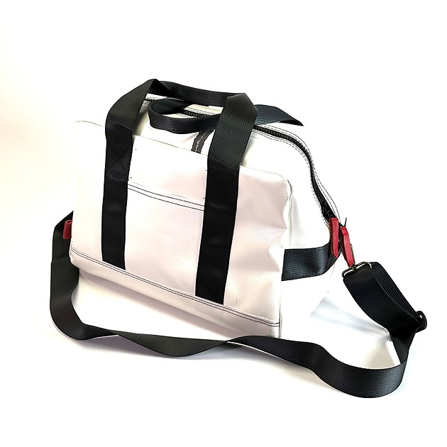 En sportbag handgjord av kapellväv från lastbilar som rullat på Europas vägar. Ett material som är tvättat och rengjort men som fortfarande har kvar en del av sin använda karaktär. Bilbältesmaterial i axelremmarna ger en nästan outslitlig egenskap.