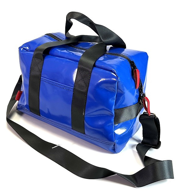 En sportbag handgjord av kapellväv från lastbilar som rullat på Europas vägar. Ett material som är tvättat och rengjort men som fortfarande har kvar en del av sin använda karaktär. Bilbältesmaterial i axelremmarna ger en nästan outslitlig egenskap.