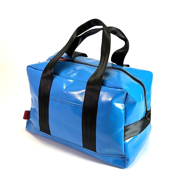 En sportbag handgjord av kapellväv från lastbilar som rullat på Europas vägar. Ett material som är tvättat och rengjort men som fortfarande har kvar en del av sin använda karaktär. Bilbältesmaterial i axelremmarna ger en nästan outslitlig egenskap.