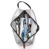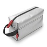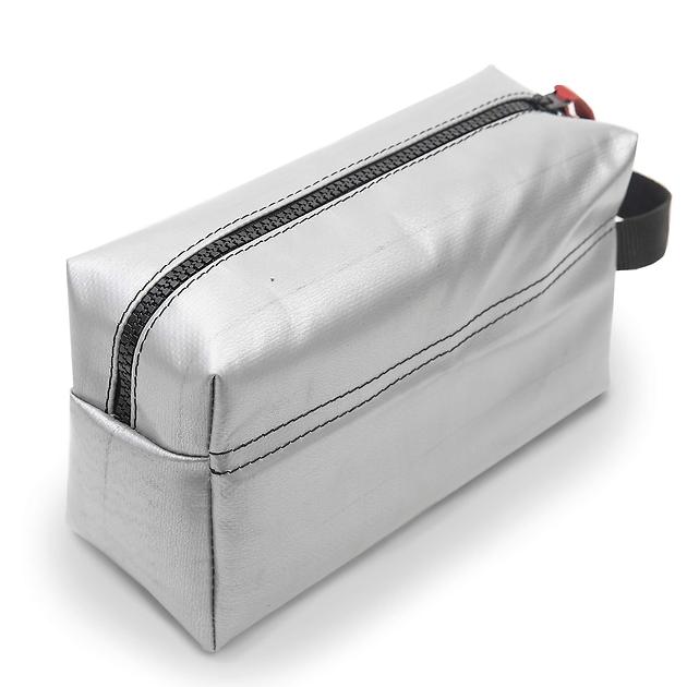 En silver necessär, handgjord av kapellväv från lastbilar som rullat på Europas vägar. Ett material som är tvättat och rengjort men som fortfarande har kvar en del av sin använda karaktär. Bilbältesmaterial i axelremmarna ger en nästan outslitlig egenskap. In sida med fickor för produkter.